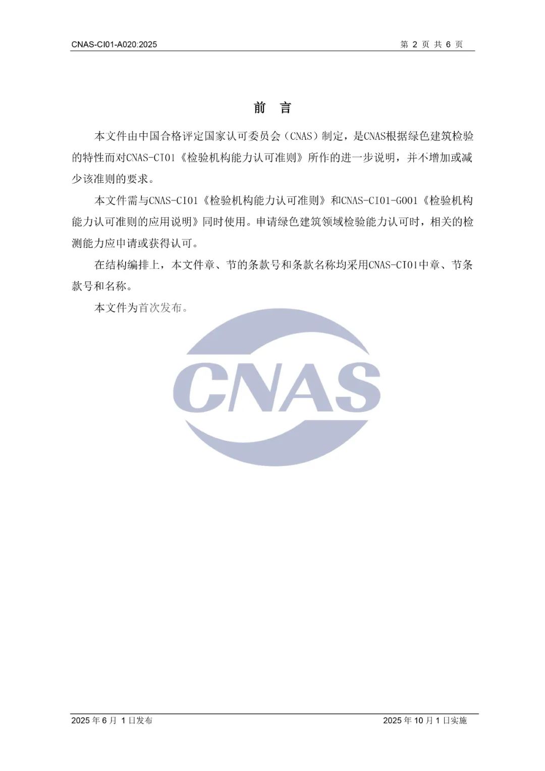 为进一步规范绿色建筑领域检验机构认可,中国合格评定国家认可委员会(CNAS)秘书处近期组织制订了CNAS-CI01-A020:2025《检验机构能力认可准则在绿色建筑检验领域的应用说明》,现已发布,将于2025年10月1日实施。