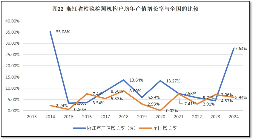 浙江省检验检测机构人均年产值增长率与全国人均年产值增长率的比较,如图19所示。