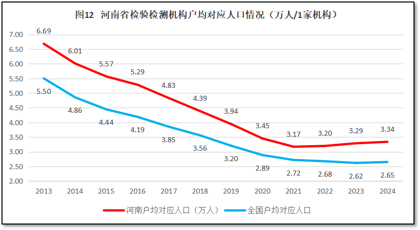 再来看河南地区检验检测机构户均对应服务的人口情况。2024年末,河南省常住人口9785万人,检验检测机构户均服务人口3.34万人,比全国平均数2.65万人高出6900人,排名全国第4。可见,相对于河南省较大的人口数量来说,当地的检验检测机构数量又显得不那么多了。过去12年,河南省检验检测机构户均对应的人口数量与全国的情况进行比较,如图12所示。