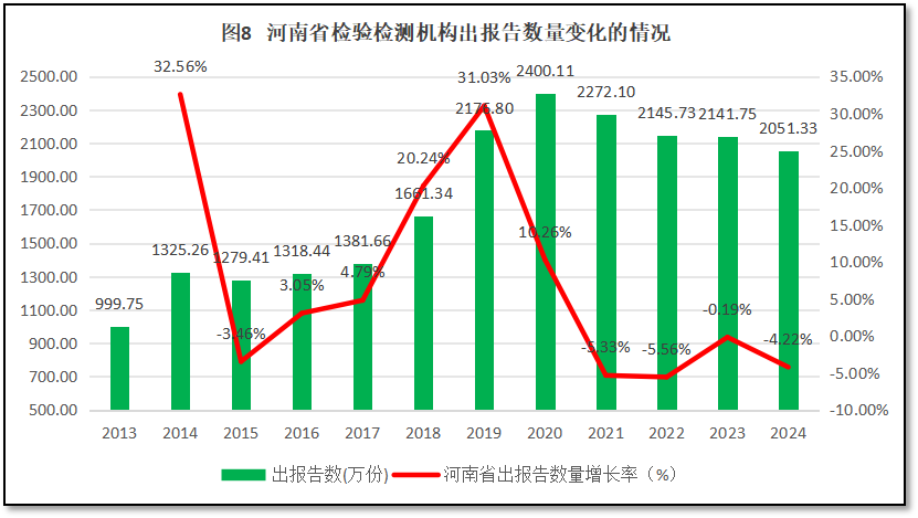 从图8来看,在2020年之前,河南省检验检测机构年度对外出具检验检测报告数量每年保持增长,逐步从1000万份左右增长到超过2400多万份。增长率在2019年达到31.03%的峰值。不过,从2020年以后,河南省检验检测机构出具报告数量逐步下降,数量回落到2024年度的2051万份左右。从增长率曲线来看,在2019年河南省检验检测机构出具报告数量增幅出现了31.03%的峰值,此后迅速下降,2021年以后连续四年均为负值,连续四年出现检验检测报告数量的“净减少”,2024年已经比2020年净减少了近350万份报告。这说明在经济下行的压力下,河南省的检验检测机构遭受到了比较大的冲击,业务量下滑很明显。